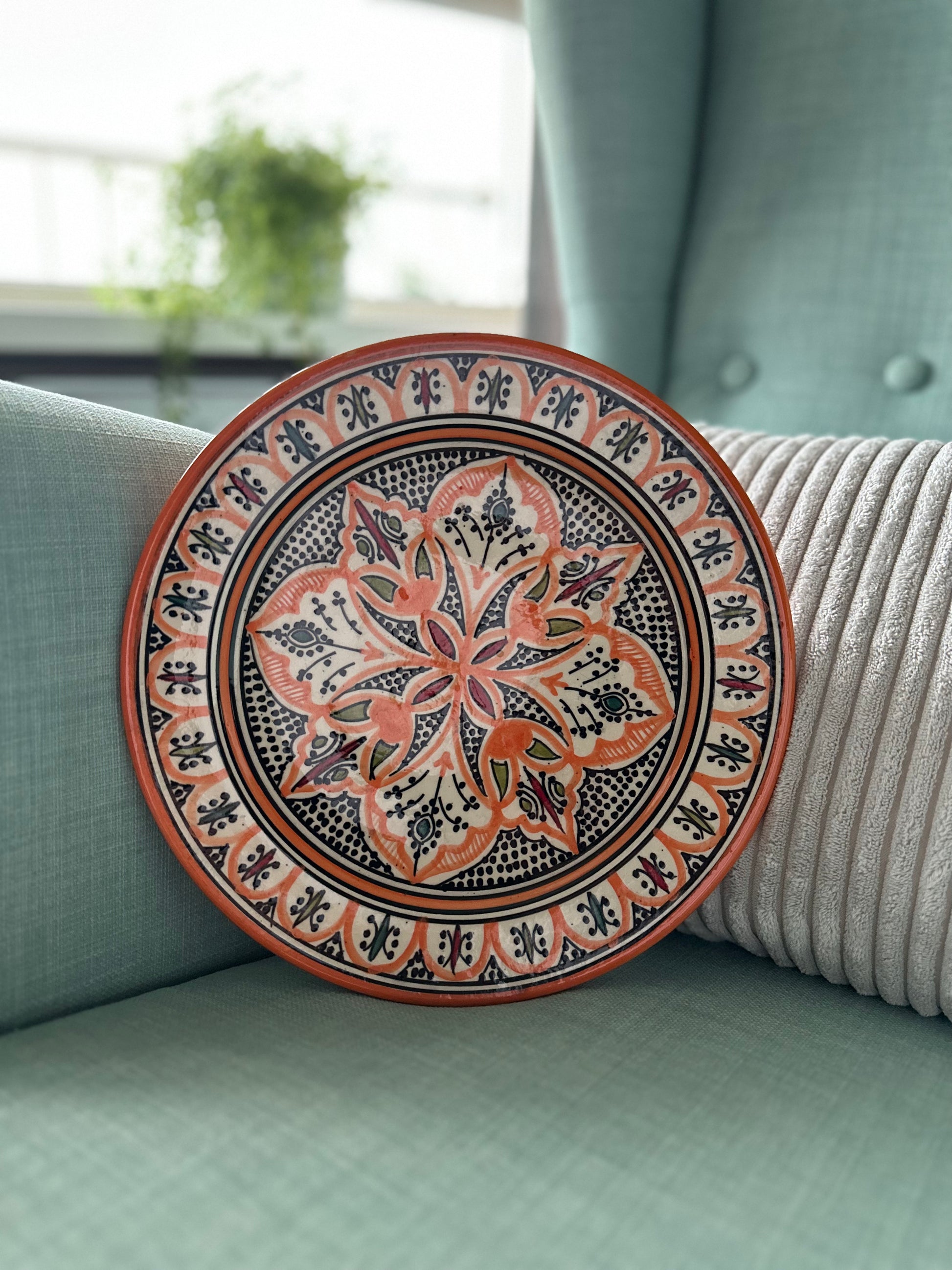 Een handgemaakt aardewerken bord dat kan worden gebruikt om koekjes of fruit op te serveren of als decoratie aan de muur kan worden gehangen.