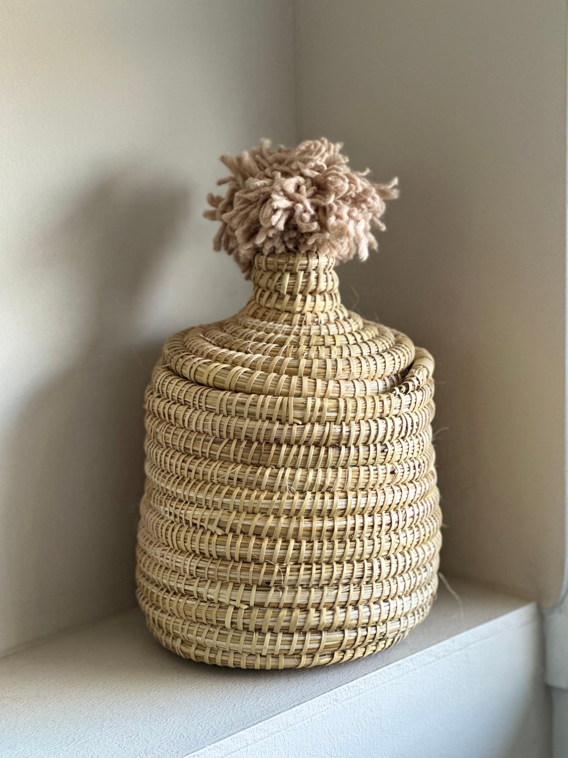 Deze pomponmand is met de hand vervaardigd door ambachtslieden in Marokko. Het is een ideale accessoire voor in huis of voor de kinderkamer. Handig om kleine spullen in op te bergen of te bewaren.